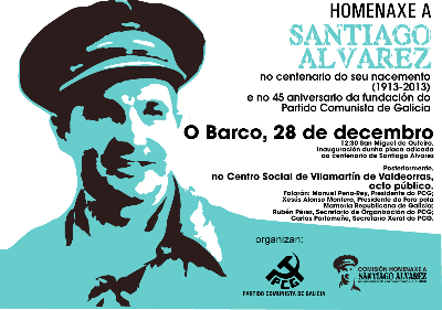 O PARTIDO COMUNISTA DE GALICIA e a Comisión para a Homenaxe a Santiago Álvarez no seu centenario celebraremos o Sábado 28 de decembro de 2013 no Concello do Barco de Valdeorras unha serie de actos en lembranza do comunista, antifascista e comisario do exército da República, fundador do PCG e figura imprescindible do comunismo galego.
