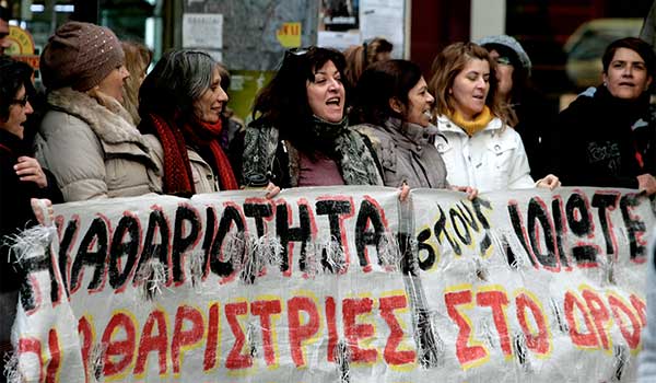 Aunque el desempleo en Grecia es del 27% y el femenino del 62,8%, el gobierno griego ha decidido despedir a las trabajadoras de limpieza, sin indemnización, sin prestaciones por desempleo y sin ninguna protección para familias monoparentales. Durante cuatro meses, desde el 18 de septiembre, las mujeres de la limpieza han protestado diariamente en las puertas del Ministerio de Hacienda. Estas mujeres están llevando a cabo una lucha titánica y la única respuesta que han recibido del gobierno es violencia y represión.