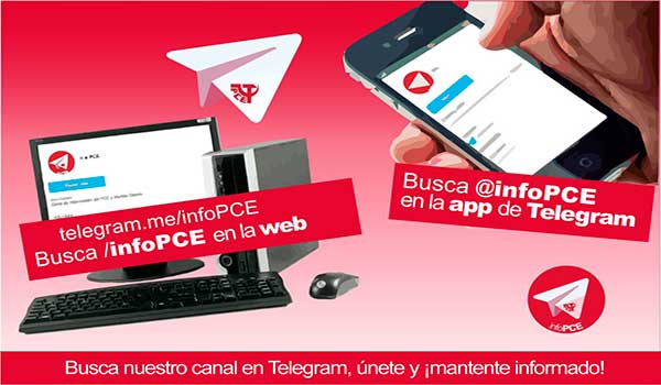 La comunicación con el conjunto de las bases sin intermediaros y en tiempo real es un elemento de acción de información fundamental para el PCE, en este sentido y utilizando las nuevas tecnologías se ha puesto en marcha el canal @infoPCE en la aplicación Telegram.