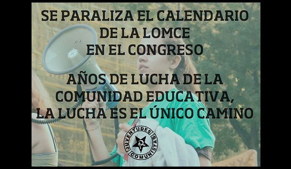 Ante esta situación, el movimiento estudiantil no podemos bajar la guardia frente a las constantes y falsas noticias de paralización de la LOMCE y de la derogación de las reválidas. Las estudiantes comunistas, junto con el resto de la comunidad educativa, tenemos que impulsar y participar en la creación de espacios donde articulemos una respuesta que proponga un modelo educativo alternativo al actual y que profundice en las necesidades de los protagonistas de la educación, las alumnas, las madres, las profesoras y las trabajadoras.