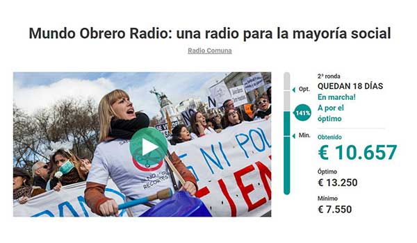 El equipo de MO Radio, hace un llamamiento a los simpatizantes y colaboradores para culminar este esfuerzo y lograr recaudar el total de la financiación en los próximos días. Les solicita que contribuyan a la difusión de la información del proyecto y de la web https://www.goteo.org/project/mundo-obrero-radio para la realización de donaciones.