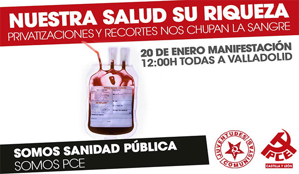 El PCE y las UJCE en CyL ven con preocupación cómo el sistema, en un nuevo proceso de acumulación de riqueza, despoja poco a poco a la clase trabajadora de sus derechos. Con lemas como “Nuestra salud, su riqueza” o “somos PCE, somos sanidad pública, el Partido Comunista llama a la movilización social en la confrontación directa con el modelo económico capitalista que explota al personal sanitario y de servicios, además de llevar a la sanidad pública hacia la privatización para el beneficio de unos pocos, generando una sanidad discriminatoria e injusta y negando el acceso en igualdad de condiciones para la población.