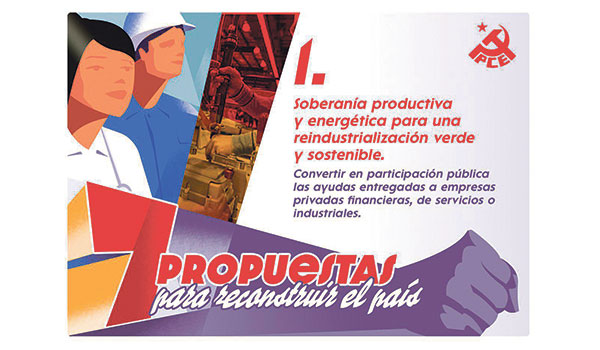 El Informe Político del Comité Central del PCE, aprobado el pasado 26 de abril, marcó las líneas esenciales para la reconstrucción económica y social de nuestro país a favor de la clase obrera y los sectores populares. El plan de reconstrucción parte de la premisa de la recuperación de nuestra soberanía económica y productiva. Y ligada a ésta está la soberanía energética. Para producir los bienes y servicios necesarios, debemos ser capaces de producir y controlar la energía imprescindible.