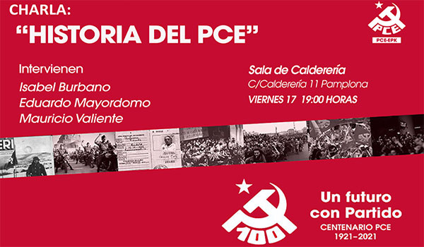 El próximo viernes día 17 de septiembre el PCE-EPK Navarra organizará una charla titulada Historia del PCE con motivo del centenario del Partido Comunista de España que celebramos este año 2021.