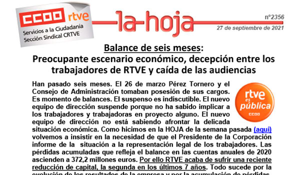 Han pasado seis meses. El 26 de marzo Pérez Tornero y el Consejo de Administración tomaban posesión de sus cargos. Es momento de balances. El suspenso es indiscutible. El nuevo equipo de dirección suspende porque no ha sabido implicar a los trabajadores y trabajadoras en proyecto alguno. El nuevo equipo de dirección no está sabiendo afrontar la delicada situación económica. Como hicimos en la HOJA de la semana pasada (aquí) volvemos a insistir en la necesidad de que el Presidente de la Corporación informe de la situación a la representación legal de los trabajadores. Las pérdidas acumuladas que refleja el balance en las cuentas anuales de 2020 ascienden a 372,2 millones euros. Por ello RTVE acaba de sufrir una reciente reducción de capital, la segunda en los últimos 7 años. Todo sucede por la evolución de los resultados de la empresa y por la acumulación de pérdidas. La situación es más que preocupante. Está en riesgo la encomienda de servicio público y el empleo en RTVE.