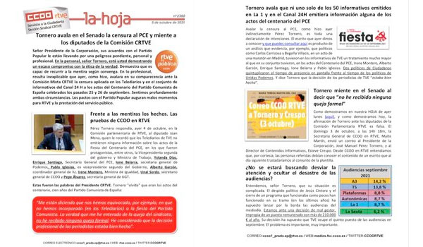 Como demostramos en nuestra HOJA de ayer lunes (aquí), y como demostramos hoy, la afirmación de Tornero ante los diputados de la Comisión Parlamentaria RTVE es falsa. El domingo 3 de octubre, a las 14h 18m, la Secretaria General de CCOO en RTVE, Maite Martín, envió un correo al Presidente de la Corporación, José Manuel Pérez Tornero, y al Director de Contenidos Informativos, Esteve Crespo. Desde CCOO en RTVE entendiamos que, por cortesía, las personas referidas debían conocer el contenido de un escrito que al día siguiente trasladaríamos al conjunto de la plantilla.
