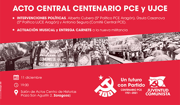 El sábado 11 de diciembre el Partido Comunista de España en Aragón (PCE Aragón) celebra en el Centro de Historias de la zaragozana plaza de San Agustín su acto anual de entrega de carnets. Al acto acudirán tanto Alberto Cubero, concejal del Ayto por Zaragoza en Común (ZeC) y Secretario Político de la formación como el Secretario de Justicia, responsable de los asuntos jurídicos en la organización, del PCE Antonio Segura. Su visita está destinada a tratar la denuncia que el partido VOX ha hecho contra el edil comunista y marcar las líneas de una futura campaña de apoyo.