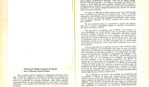 Por su parte, el texto de Juan Gómez (Tomás García) insiste en algunos de los elementos expuestos previamente en el informe de Carrillo y trata de responder a las líneas de debate que habría podido suscitar en el seno del congreso. En este sentido, sus palabras muestran la importancia que este elemento había adquirido dentro del nuevo rumbo que el PCE estaba construyendo durante aquellos años. El europeísmo del partido era presentado como un factor inseparable de la nueva línea general de la organización. Más allá del debate entre los delegados asistentes al encuentro, esta cuestión levantaría algunas polémicas internas. Esta actitud suponía un cambio de postura respecto a lo que había sido la apuesta tradicional de los comunistas españoles ante el proceso de integración europeo. Precisamente por eso, fue visto por algunos sectores ortodoxos como una renuncia a una parte importante de la identidad comunista. Por ejemplo, en 1971 se creaba el PCE (VIII Congreso) liderado por Enrique Líster y Eduardo García. Este partido criticaba a Carrillo por su concepción de la articulación europea, que consideraba «reformista». Tanto era así que la CEE era concebida como una «organización supranacional de los monopolios destinada a aumentar la explotación de los trabajadores». Otro caso muy representativo a este respecto fue la creación de la Oposición de Izquierdas del PCE (OPI) en 1973, quien veía en el europeísmo del PCE un síntoma de su derechización. La OPI estaba formada por sectores del partido— principalmente profesionales y estudiantes universitarios— a quienes no convencía nada la nueva postura del PCE en relación al Mercado Común Europeo.