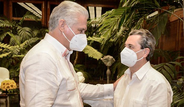 En el encuentro, ambos dirigentes abordaron temas relacionados con el acontecer regional e internacional. El mandatario cubano agradeció al dirigente comunista español por su permanente respaldo en el enfrentamiento al bloqueo económico, comercial y financiero impuesto por el Gobierno de Estados Unidos contra nuestro pueblo, recrudecido en tiempos de pandemia.