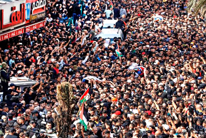 Decenas de miles de palestinos han participado este 25 de octubre en el funeral de los cinco palestinos asesinados a primera hora de la mañana por soldados israelíes durante un asalto del ejército a la ciudad de Naplusa, en el norte de Cisjordania. Los asistentes portaban la bandera palestina y pancartas negras mientras denunciaban la agresión y los asesinatos israelíes.