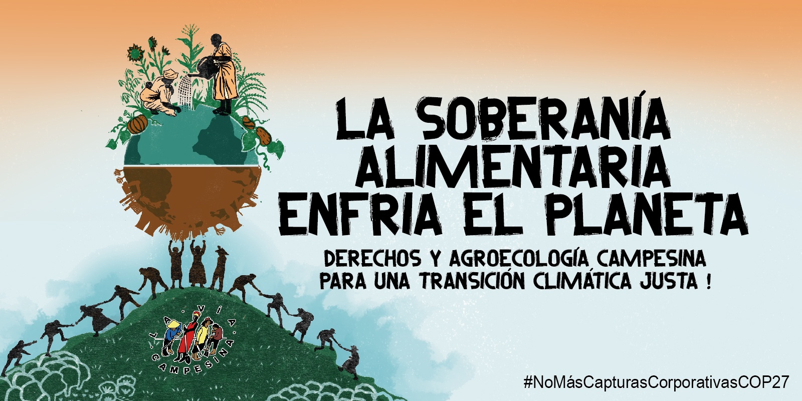 Mientras la mayoria de los gobiernos nacionales y las instituciones multilaterales ofrecen soluciones capitalistas que continúan fracasando en la lucha contra la crisis climática, nosotrxs, la voz organizada de más de 200 millones de campesinxs, pueblos indígenas, trabajadorxs sin tierra, pescadorxs, pastorxs, trabajadorxs agrícolas migrantes, pequeñxs y medianxs agricultorxs, luchadores por la Soberanía Alimentaria, miembros de comunidades rurales, costeras y urbanas, mujeres, jóvenes y personas de diversas identidades de género que conforman La Vía Campesina, en convergencia con una diversidad de movimientos por la Justicia Climática, reiteramos aquí y ahora nuestras soluciones reales: ¡LA SOBERANÍA ALIMENTARIA ENFRIA EL PLANETA! La logramos con la Agroecología y los Derechos Campesinos para garantizar una Transición Justa arraigada en el poder popular, el bienestar ecológico y social, y la solidaridad en el contexto local, regional e internacional. ¡Juntos, en la lucha, venceremos!