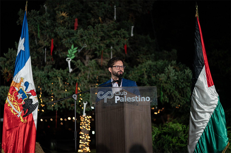 El miércoles 21 de diciembre, el Presidente de la República de Chile, Gabriel Boric, durante las celebraciones de la ceremonia de encendido del árbol de Navidad realizadas en el Club Palestino, ubicado en la comuna de Las Condes, Región Metropolitana de Chile, anunció la apertura de una embajada de Chile en Palestina durante su gobierno.