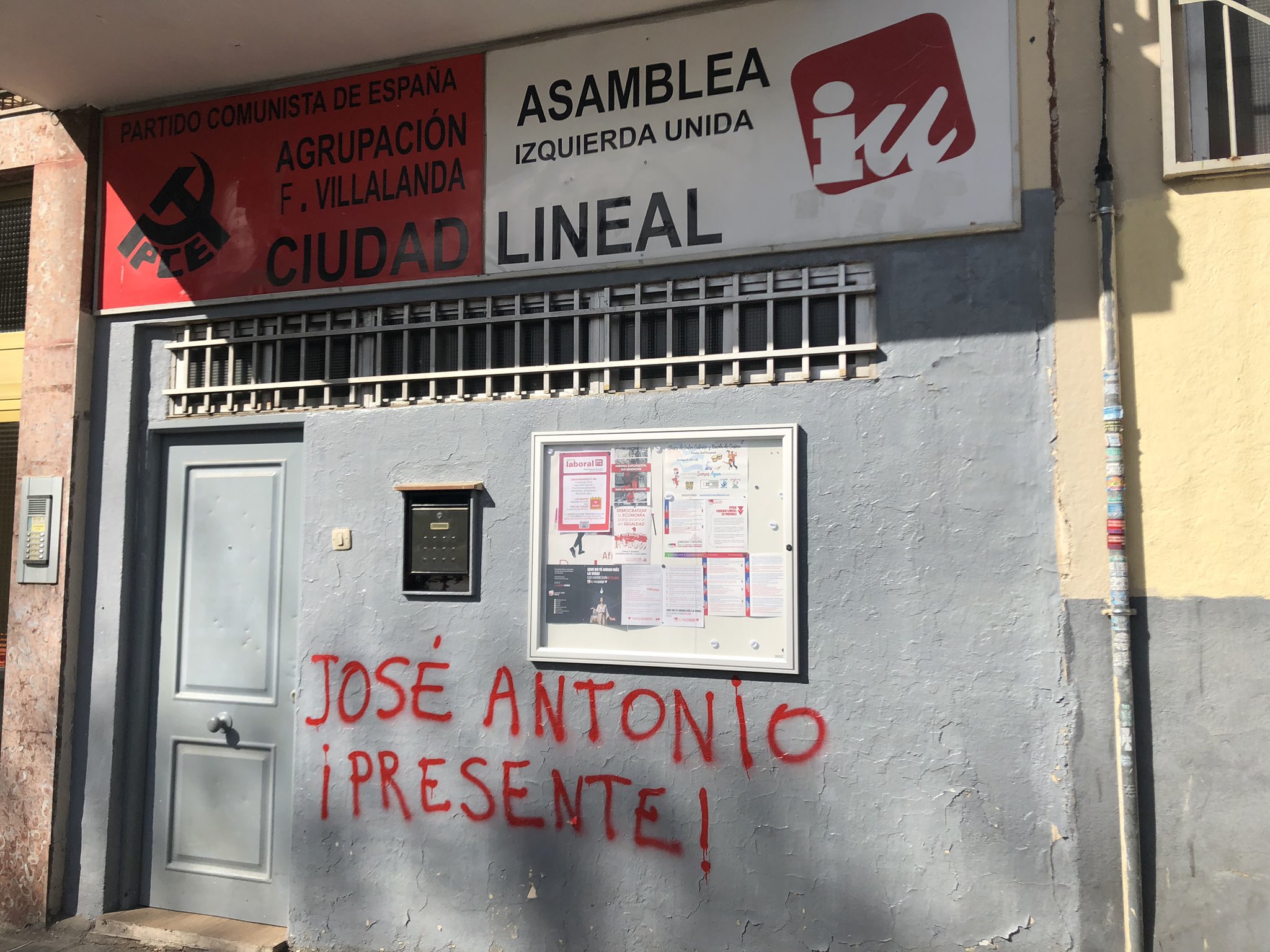 Los ataques producidos en la capital se dirigían contra el Centro Social La Sede, en el distrito de Moratalaz y la sede del PCE en Ciudad Lineal. Hemos podido hablar con una militante comunista de Moratalaz que nos ha trasladado que no es la primera vez que atacaban La Sede. Ya había pasado con anterioridad y con la misma temática fascista, “la anterior ocasión pusieron algo alabando a Franco durante los días de la exhumación” -nos dice- en la sede del PCE en Moratalaz. Sobre la raíz de estos ataques nos explica que en el distrito de San Blas-Canillejas “se juntan varios grupos fascistas desde hace años”. Al ser distritos colindantes estos grupos pueden tener presencia en Moratalaz también. “Suelen pegar pegatinas o realizar este tipo de pintadas” añade.