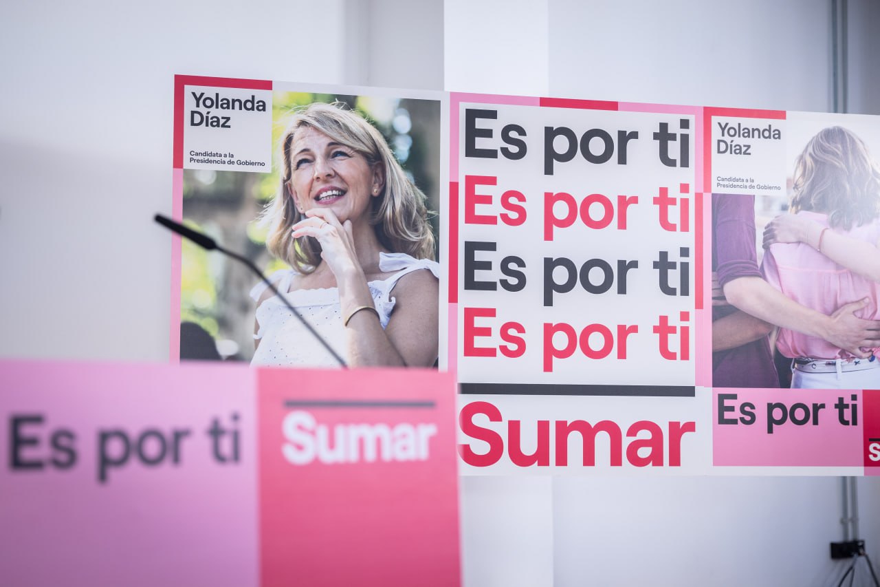 La coalición presentó tres carteles: uno más clásico, con Díaz de frente y el lema «Es por ti» acompañándola, un segundo en el que únicamente se repite el eslogan, y un tercero en el que Yolanda Díaz aparece de espaldas abrazada a otras personas. Sumar también ha diseñado los mismos carteles con el lema traducido al gallego, al catalán y al euskera.