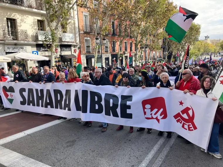 Madrid ha sido escenario este sábado de una multitudinaria manifestación en apoyo al Sáhara Occidental, convocada por la Coordinadora Estatal de Asociaciones Solidarias con el Sahara (CEAS-Sahara) y la Federación de Asociaciones Madrileñas de Amigos del Pueblo Saharaui (FEMAS). Bajo el lema «Autodeterminación del Sahara Occidental. ¡Por el cumplimiento de las sentencias del Tribunal de Justicia de la UE!», cientos de personas recorrieron el centro de la capital, desde Atocha hasta la Puerta del Sol, exigiendo el fin de la ocupación marroquí y el respeto al derecho internacional.