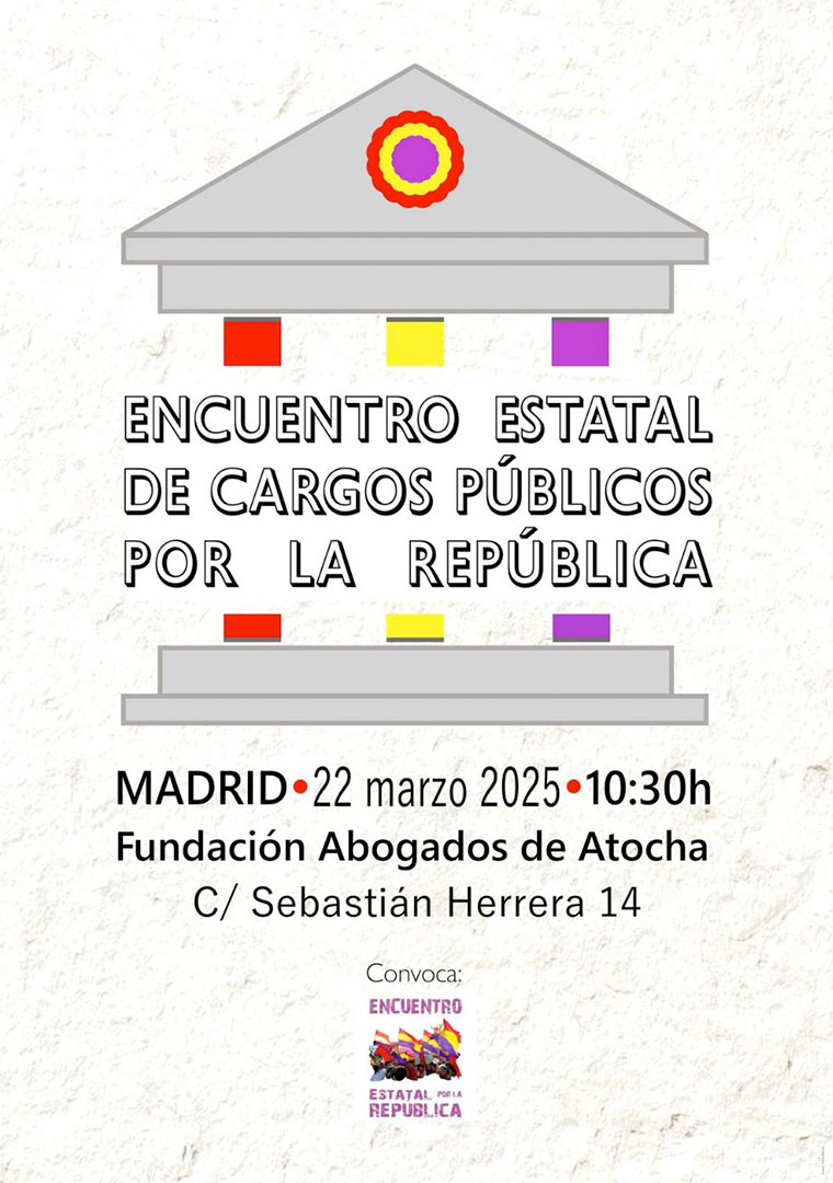 El sábado, día 22, en Madrid tendrá lugar el Encuentro Estatal de Cargos Públicos por la República en el que Izquierda Unida va a participar con decenas de responsables públicos en diferentes ámbitos institucionales y que contará también con la intervención también de responsables de otras organizaciones políticas.