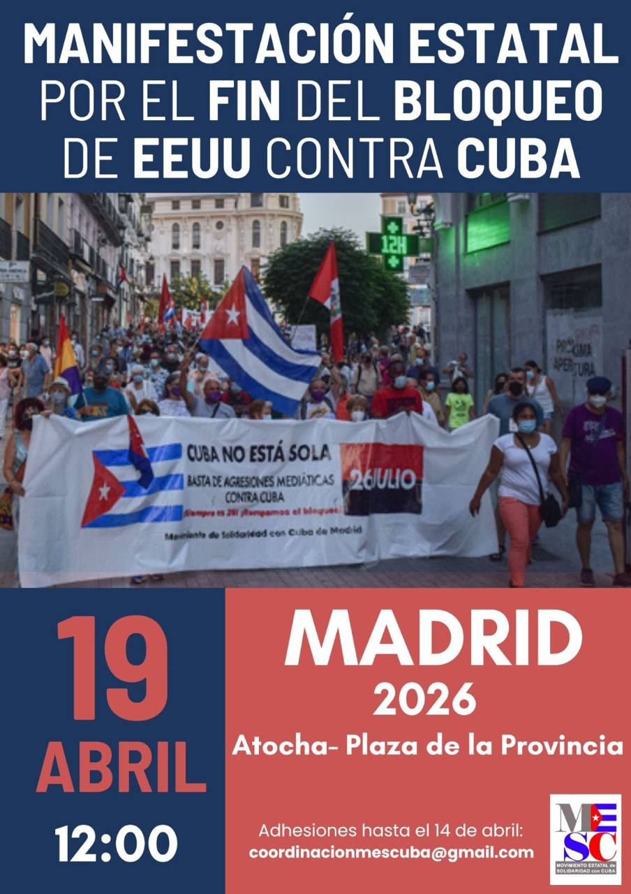 Madrid será escenario el próximo 19 de abril de una manifestación estatal convocada para reclamar el fin del bloqueo de Estados Unidos contra Cuba. La movilización, prevista a las 12:00 horas, recorrerá el trayecto entre Atocha y la Plaza de la Provincia bajo el lema “Cuba no está sola”.